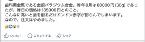 2、3年前この金銀パラジウム合金(通称金パラ)は30グラムで5万円程度だったものが今では13万以上